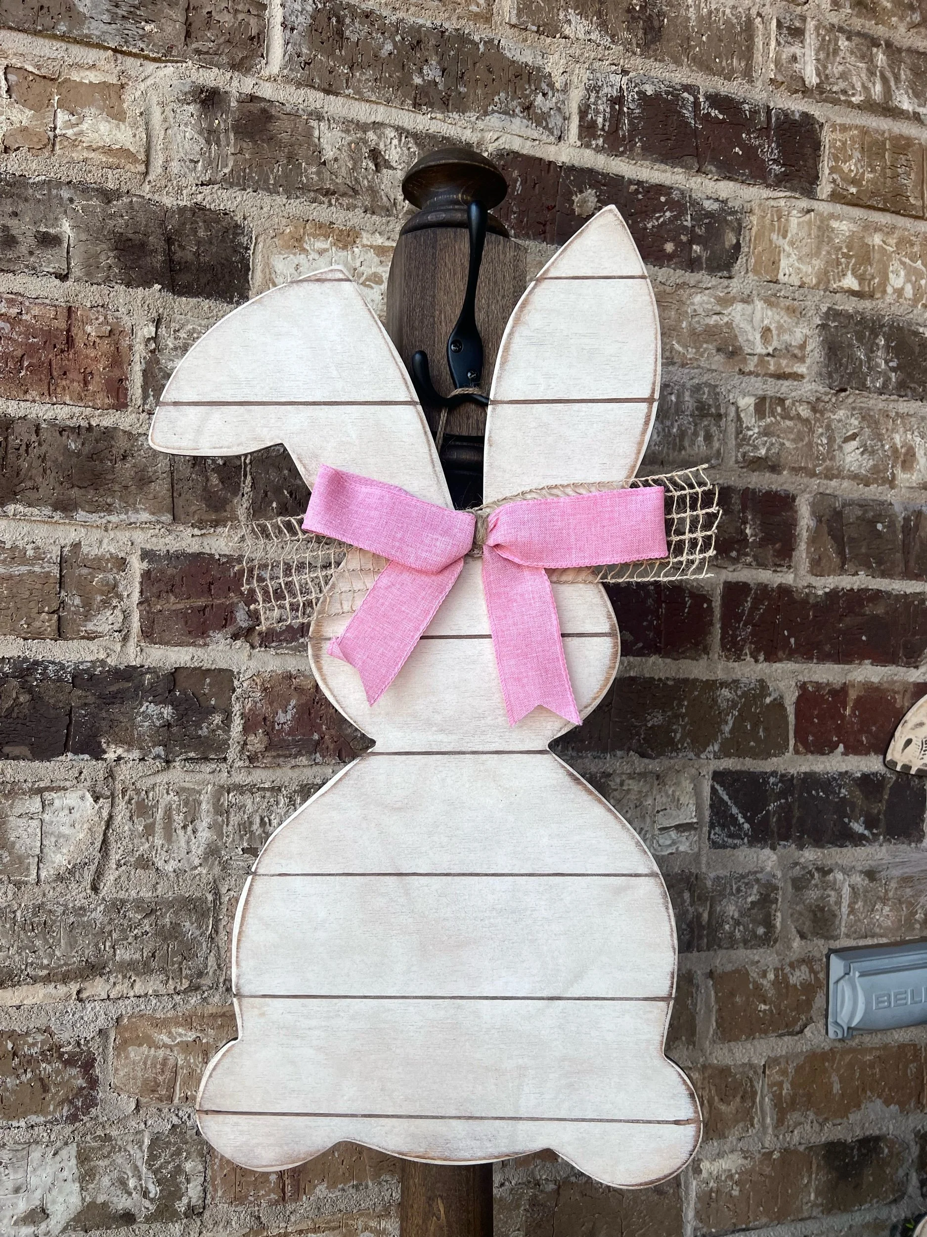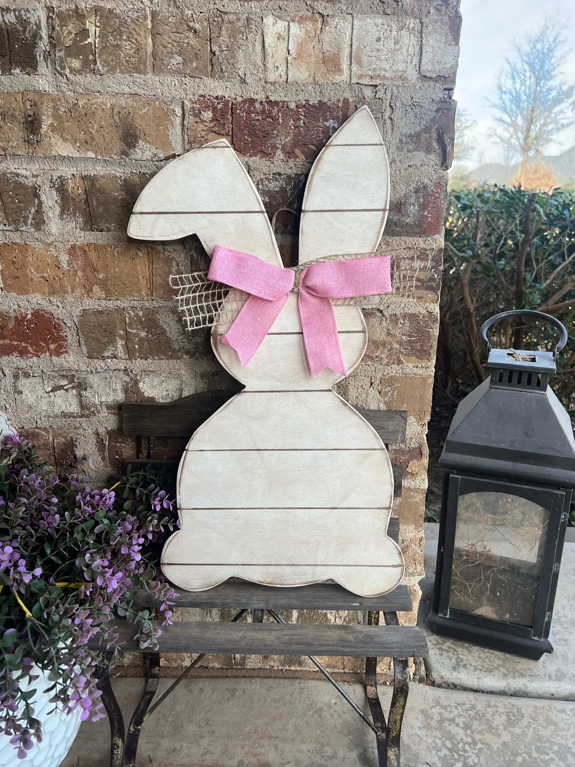 This bunny features subtle shiplap detailing with gentle distressing and layered script for a clean, welcoming look. Finished with natural textures and a touch of color, it feels timeless rather than trendy.