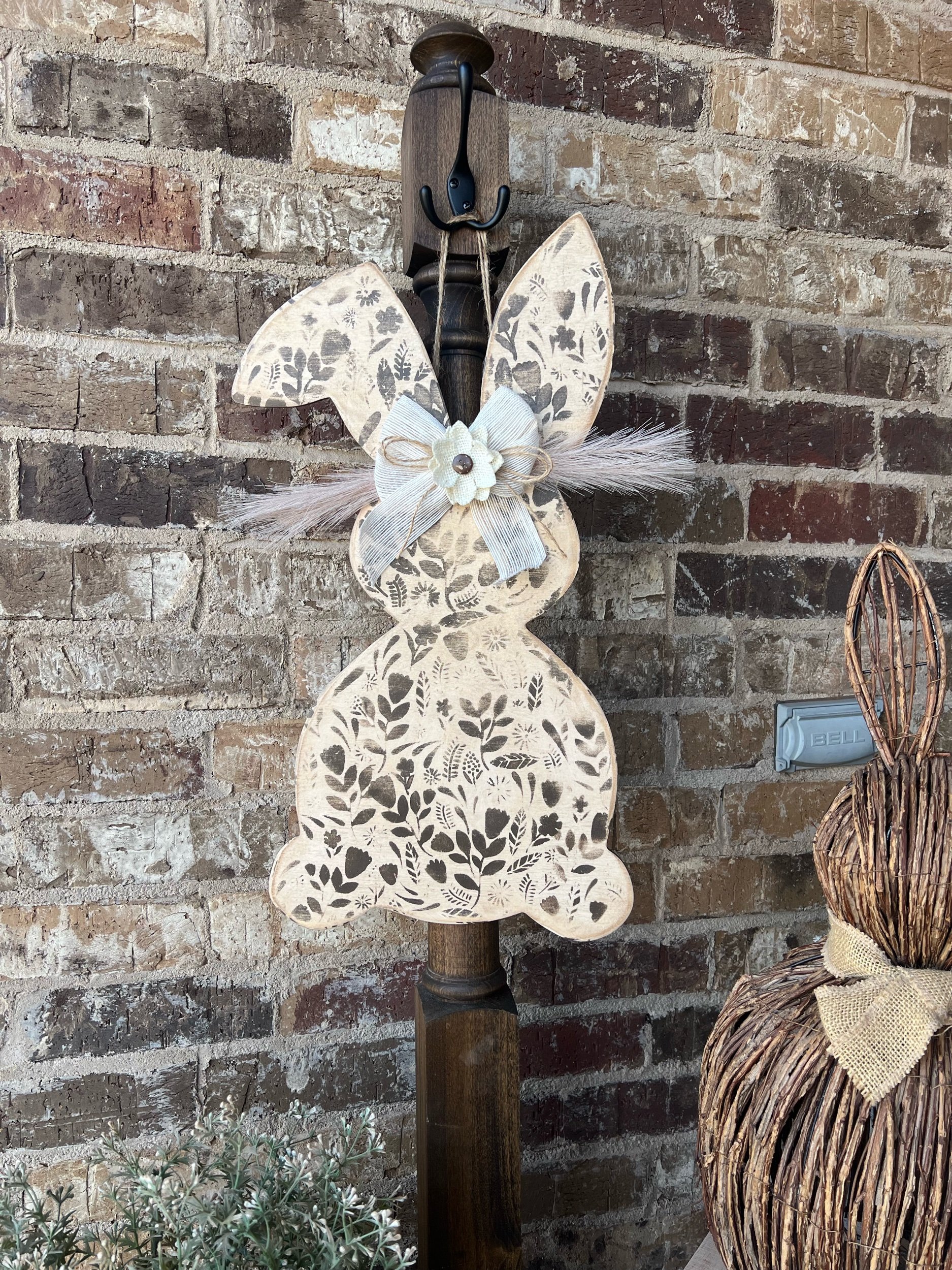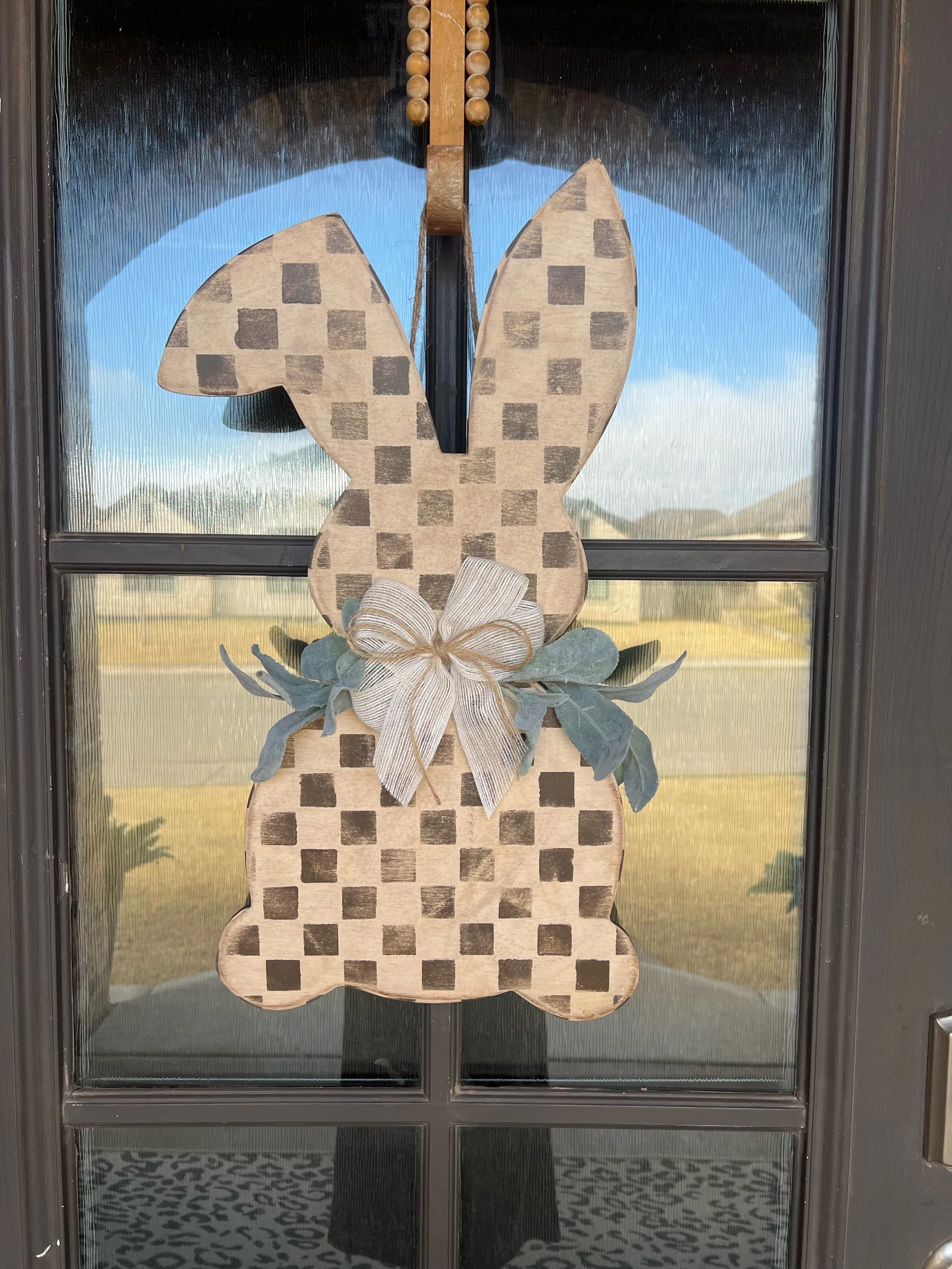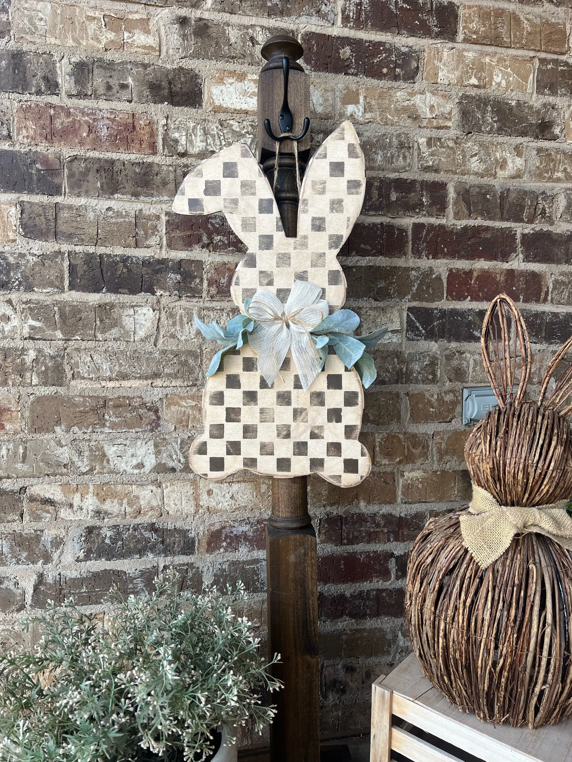 This bunny features a hand-painted soft check pattern in warm neutral tones, giving it a relaxed farmhouse feel while still remaining subtle and elegant.