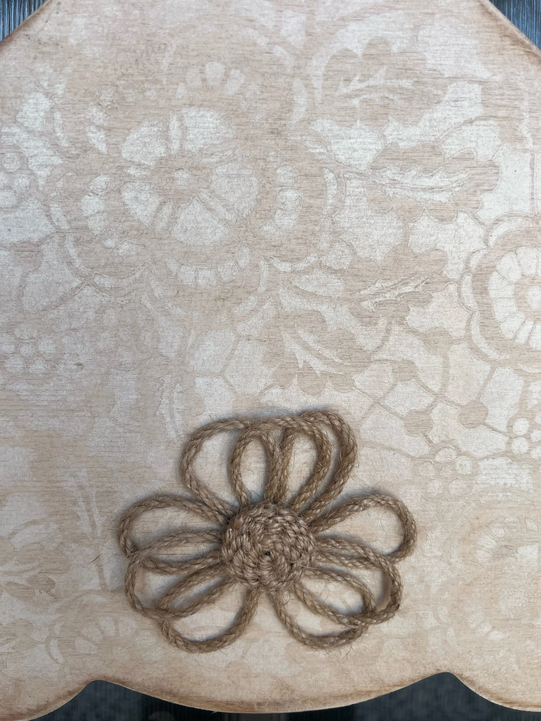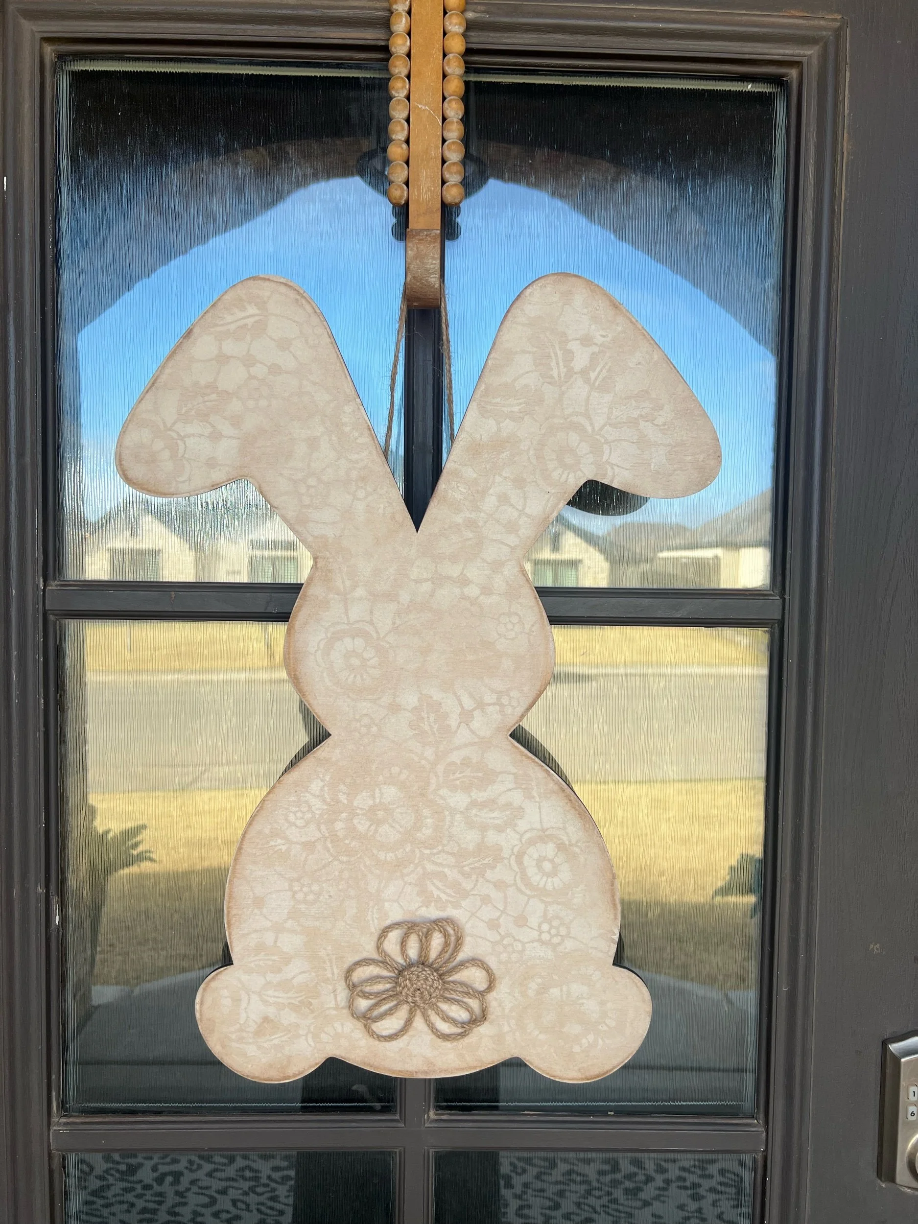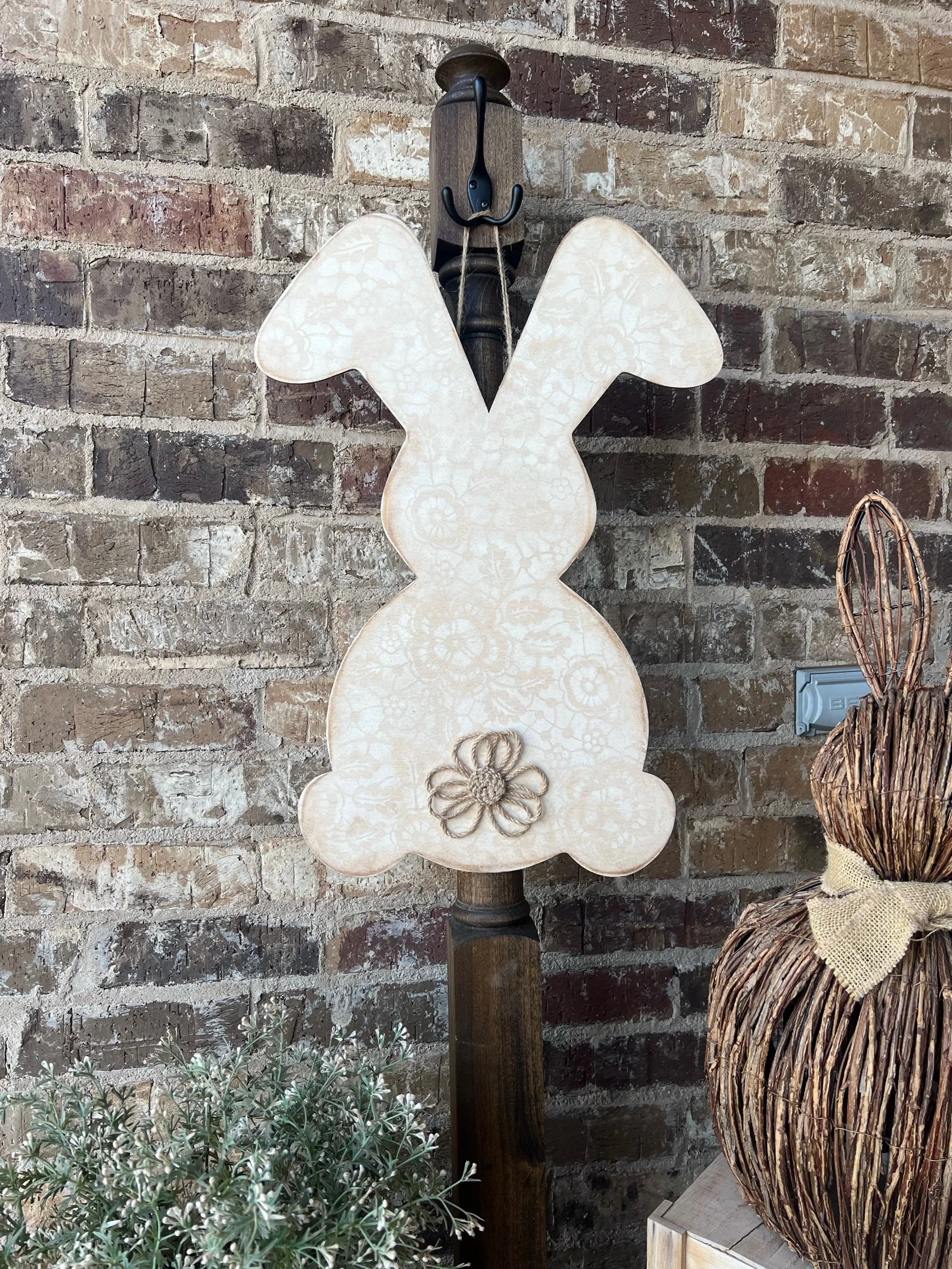 A delicate repeating fleur-inspired stencil pattern gives this bunny a refined, classic feel. Soft distressing and layered neutrals highlight the texture of the wood beneath.